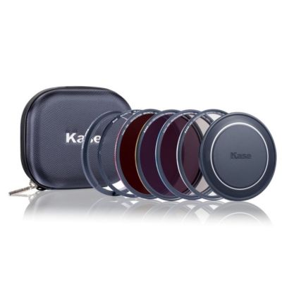 The Kase KW Revolution filter sets typically include a range of neutral density (ND) filters and a circular polarizer (CPL). The standard set consists of ND8 (3-stop), ND64 (6-stop), and ND1000 (10-stop) filters, as well as a CPL filter. These filters are magnetic and can be easily stacked and exchanged thanks to their colour-coded design.